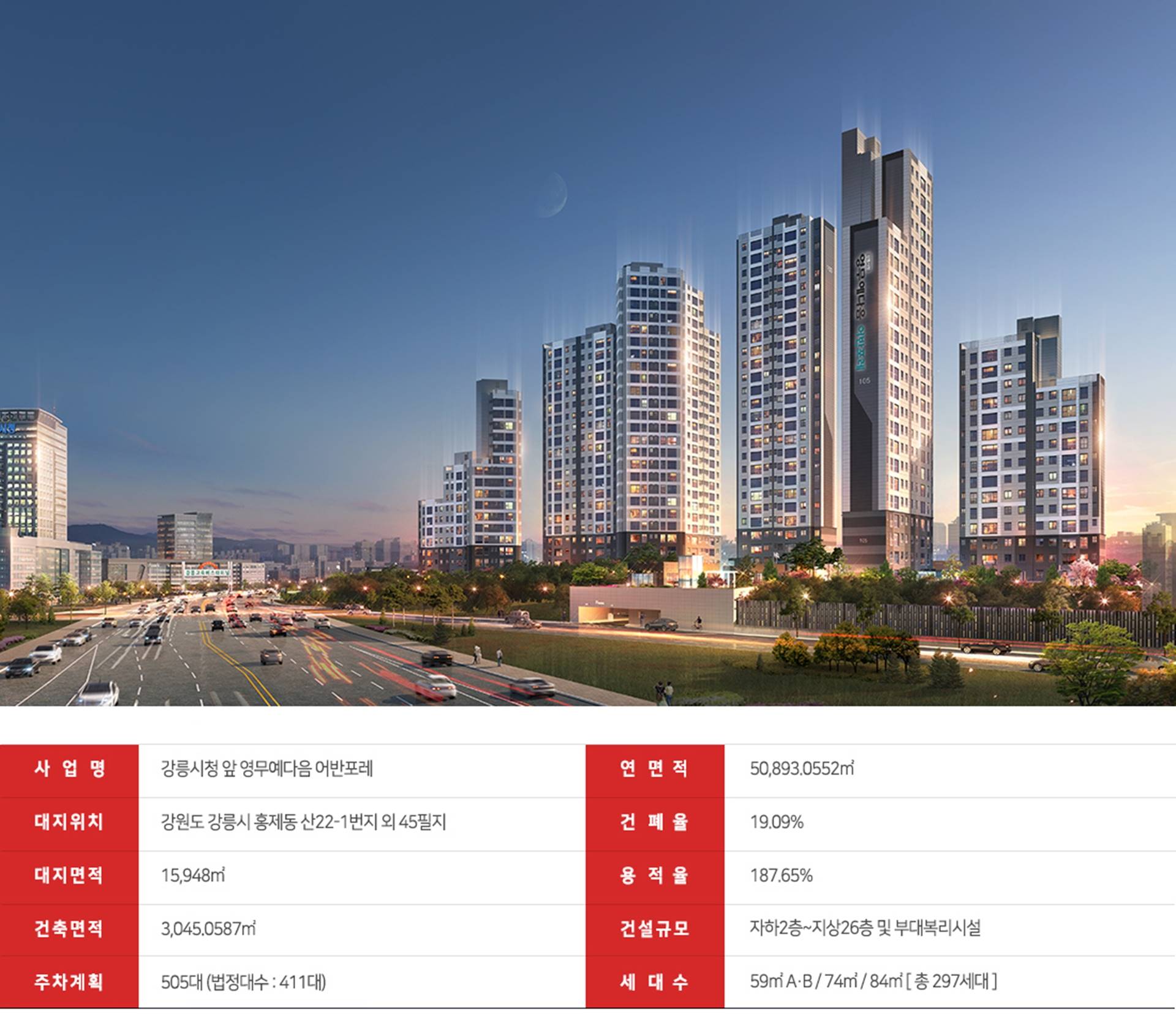 강릉 홍제동의 새로운 랜드마크 스케일 지상 최고 26층 높이로 완성되는 총 297세대 대단지 강릉 홍제동의 스카이라인을 바꾸는 최고 26층 높이로 건설되어 지역을 대표하는 상징성과 우수한 조망 가치를 선사합니다. 도심(Urban)과 숲(Foret)을 잇는 입지 강릉 도심 생활 인프라와 쾌적한 자연 환경을 동시에 누림 강릉 시청 인근의 도심 접근성과 동시에 자연을 가까이에서 누릴 수 있는 가장 이상적인 주거 환경인 '어반포레' 라이프를 제공합니다. 전매제한/거주의무 없는 비규제 프리미엄 규제 완화 혜택으로 자유로운 내 집 마련 기회 강릉시는 비규제지역으로 전매제한 및 거주의무가 없어 실수요자와 투자자 모두에게 유리한 조건을 갖춥니다. 영무예다음 브랜드의 혁신 설계 고품격 마감재와 입주민을 위한 다양한 커뮤니티 시설 영무건설의 검증된 기술력과 고급 마감재를 적용하고, 피트니스 센터 등 수준 높은 커뮤니티 시설을 조성합니다. 중소형부터 중대형까지 폭넓은 평형 다양한 라이프스타일을 만족시키는 맞춤형 평면 구성 59㎡, 74㎡, 84㎡를 비롯해 111㎡까지 구성되어 다자녀 가구 및 다양한 세대 구성원의 니즈를 충족시킵니다. 도심 접근성과 편리한 교통팔달 강릉의 주요 생활 인프라를 빠르게 이용 가능한 환경 강릉 도심의 중심부에 가까이 위치하여 편의 시설, 상업 시설 및 주요 관공서 이용이 매우 편리합니다. 초기 부담을 낮춘 금융 조건 계약금 및 중도금 등 다양한 금융 혜택 제공 합리적인 분양가와 함께 초기 계약금 부담을 낮추고 중도금 무이자 등의 금융 혜택을 제공하여 접근성을 높입니다.
